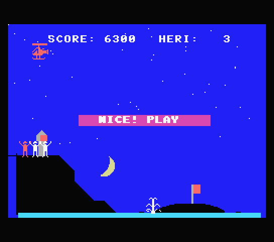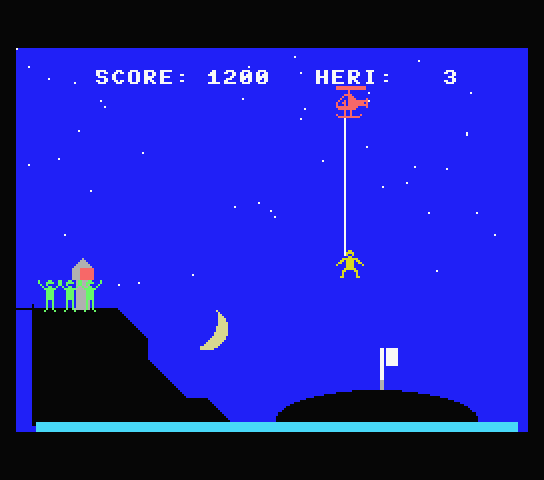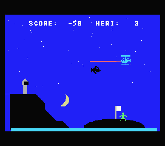 題名のごとくヘリコプターアクションゲームです。舞台はマグマ活動で沈みつつある島。そこに取り残された人々をヘリコプターで救出しましょう。しかし島の上空に浮遊する「マグマの化身」*2が妨害してきます。ぶつかればワンミスです。ビームで攻撃するなりうまく避けるなりして対処しましょう。ビームは一発撃つごとにスコアが10点減ります。