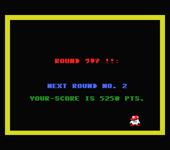 ご覧のとおりの当時の定番中の定番、階層状のフィールドを舞台とする「階段アクション」こと、プラットフォーマーアクションゲームです。主人公アカ丸を操り、敵となった双子の兄弟アオ丸率いるブルーリバーズ軍団をかわし、宝と旗を奪取しましょう。全ての宝を取ると旗が取れるようになります。さらに旗を取ると現れるドル袋を取ればラウンドクリアです。