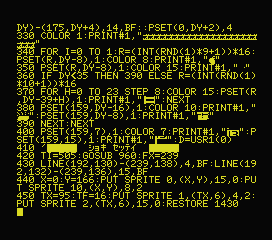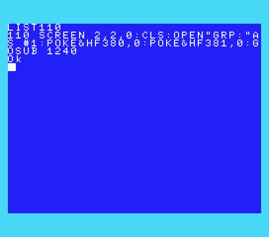 *1:具体的にはワークエリアCGPNT(ROM上の文字フォント格納アドレス・F91FH番地から3バイト分)の番地指定部分をE000Hに書き換え、フォントが格納されている1BBFH番地から2047バイト分のデータをRAMのE000H番地以降にコピーしておいてから、コピー先のBGにする文字部分にPOKE命令でグラフィックデータを書き込むことで、任意のBGを定義している。