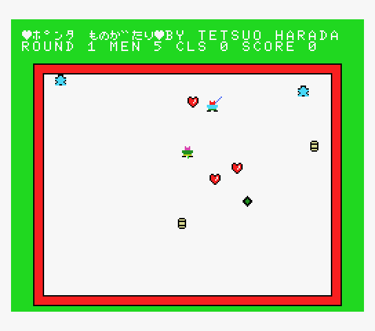本作は固定画面アクションゲームです。主人公はポンポコピー星のポンポコナー共和国に住むペンタ族の王子パイポ。些細なことがきっかけで敵対関係になってしまったポンタ族と和平を結ぶべく、ポンタ族の王子に合いに行くのだが…というストーリーがあるんですが、まぁ、知らなくても遊ぶのに全く支障はありません(おい)。
