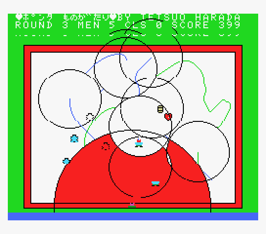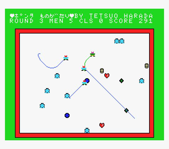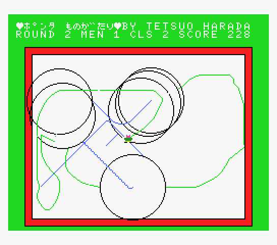 フィールドには敵としてポンタ族も出現します。こちらも王子同様、軌跡を残しながら移動します。敵にぶつかってもミスにはなりませんが、こちらの軌道に当たってもやはりワンミスです。さらに敵が王子や自身の軌跡に当たっても自滅します。ゲームとしては変型「ライトサイクル」ゲームとでも言えばいいのでしょうか。